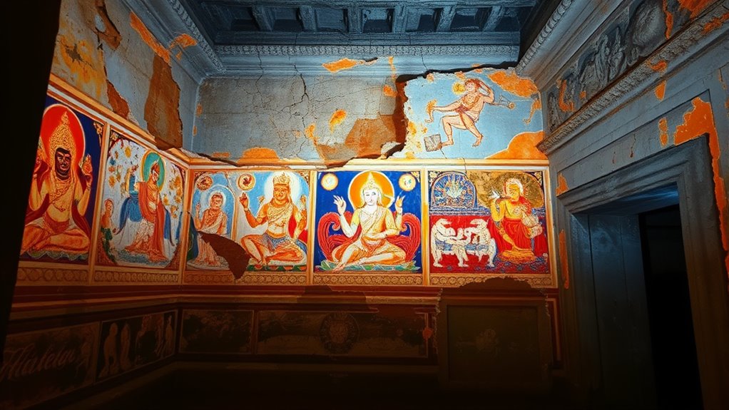 Imagine the delicate beauty of ancient masterpieces in a museum display, protected yet vulnerable. You’re responsible for their preservation, so restoration techniques focus on gentle cleaning and climate control to prevent damage. Experts also monitor environmental conditions constantly. These efforts ensure the paintings survive for future generations, blending cutting-edge technology with traditional methods. Your role in conservation safeguards this priceless heritage, allowing visitors to marvel at history’s silent stories.