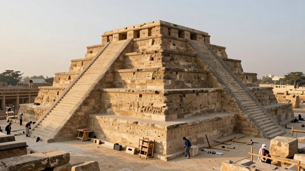 The success of pyramid construction relied heavily on understanding and organizing the workforce that powered these monumental projects. You might assume slaves did all the work, but evidence shows a well-organized labor force, including skilled craftsmen, artisans, and laborers. These workers were often fed a specialized ancient cuisine that maintained their strength and health. Seasonal work allowed communities to contribute without disrupting agriculture. Religious symbolism played a key role in motivating the workforce, as building the pyramids honored gods and pharaohs, reinforcing societal cohesion. Workers likely saw their labor as a sacred duty, which fostered dedication and cooperation. This complex social structure underscores a society that strategically supported its massive construction projects through clear roles, spiritual motivation, and resource management.