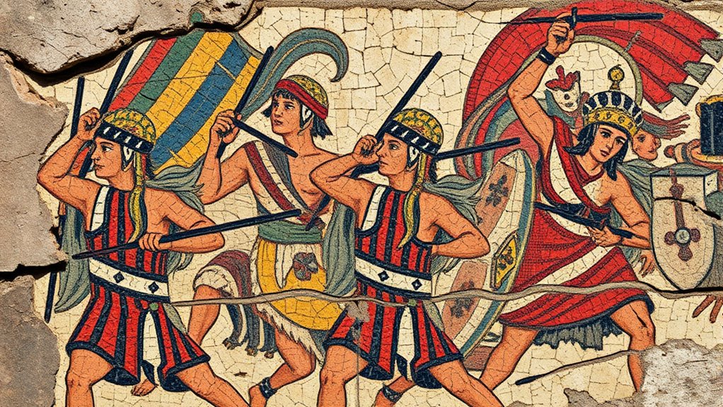 During the revolt, Spartacus used a variety of tools and weapons that reflected typical slave weaponry and revolt strategies. You’d see him wielding swords, daggers, and makeshift weapons like clubs or farm tools repurposed for combat. His tactics often involved surprise attacks and guerrilla warfare, emphasizing mobility and adaptability. These tools and strategies helped him lead a formidable resistance against the Roman forces, showcasing resourcefulness and strategic planning.