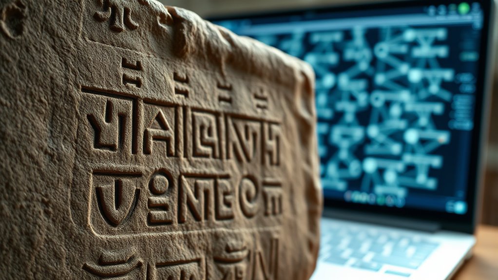 You might wonder how AI compares to traditional linguistics in script decoding. Machine learning offers a game-changing edge, analyzing patterns quickly and uncovering connections humans might miss. Unlike traditional methods, AI can process vast data sets, accelerating discoveries. However, it still relies on linguistic comparison to interpret context. Together, AI and linguistics form a powerful alliance, transforming the way we unravel ancient mysteries—one code at a time, with suspense mounting at every breakthrough.