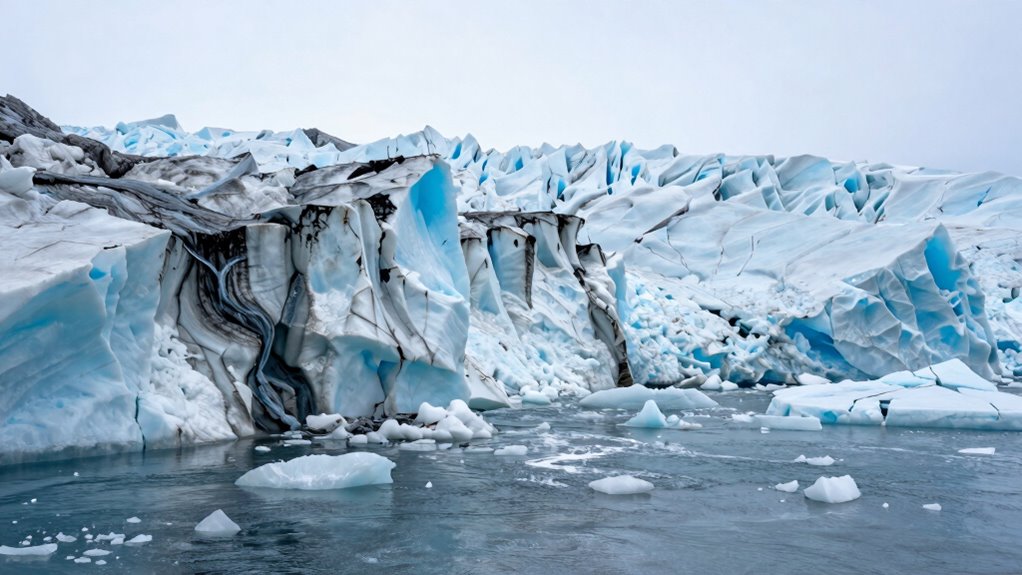 As melting patterns become more pronounced, they reveal clear signals of current climate change. You can observe changes in glacier dynamics, such as accelerated retreat and increased calving, indicating warming temperatures. These patterns show that glaciers are losing mass faster than before, reflecting global climate trends. Additionally, meltwater chemistry shifts as melting exposes different layers of ice and rock, altering the composition of runoff. Increased meltwater flow indicates higher surface temperatures and enhanced melting rates. Variations in meltwater chemistry also signal changes in local climate conditions and glacier health. Together, these melting patterns and chemical signals provide direct evidence that climate change is intensifying, helping you understand the urgency of reducing greenhouse gas emissions to slow this ongoing process.