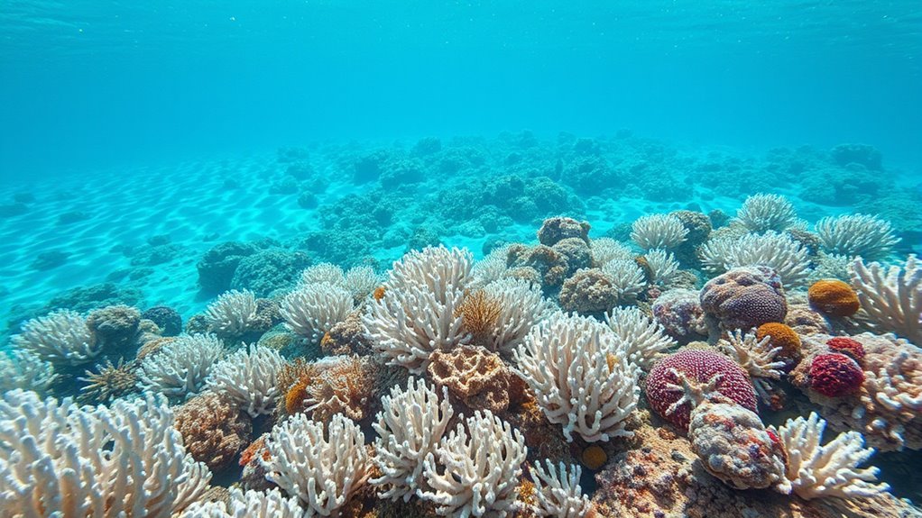 You’ll notice that some regions bear the brunt of bleaching, acting like hotspots on a fiery map. These areas, often in the Caribbean and Southeast Asia, face more severe impacts due to regional disparities like higher water temperatures and pollution. While reefs worldwide suffer, understanding hotspot impacts helps target conservation efforts. By supporting local initiatives, you contribute to protecting these vulnerable regions and helping reefs recover from the devastating bleaching events.