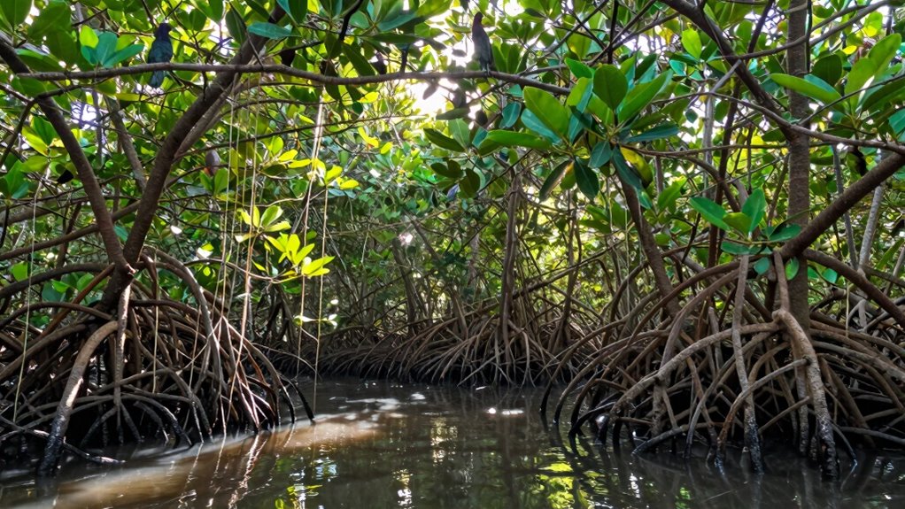 Mangroves are exceptional at capturing and storing carbon because their dense root systems trap organic matter directly from the water and soil. This unique structure supports high mangrove biodiversity, creating a complex habitat that sustains numerous species. Their roots slow water flow, reducing erosion and shielding coastlines from storm surges, making them essential for coastal protection. The extensive root networks sequester large amounts of organic carbon below ground, where it remains stored for decades. Unlike other ecosystems, mangroves thrive in challenging conditions like saline waters, maximizing their ability to act as carbon sinks. Their high water tolerance enables them to survive and function effectively in harsh environments, further enhancing their capacity for carbon sequestration. This combination of biodiversity, resilience, and physical structure makes mangroves highly effective at trapping atmospheric carbon and safeguarding coastal regions. Additionally, their ability to adapt to saline and nutrient-poor soils allows them to colonize areas where few other plants can survive, increasing their overall contribution to carbon storage. Their ability to thrive in adverse conditions means they can expand into degraded or eroded areas, helping to restore ecosystems and enhance carbon capture. Moreover, their capacity to tolerate extreme environmental conditions ensures they remain resilient in the face of climate change, bolstering their role as vital carbon sinks. Furthermore, their capacity to regenerate quickly after disturbances helps maintain their function as carbon reservoirs over time.