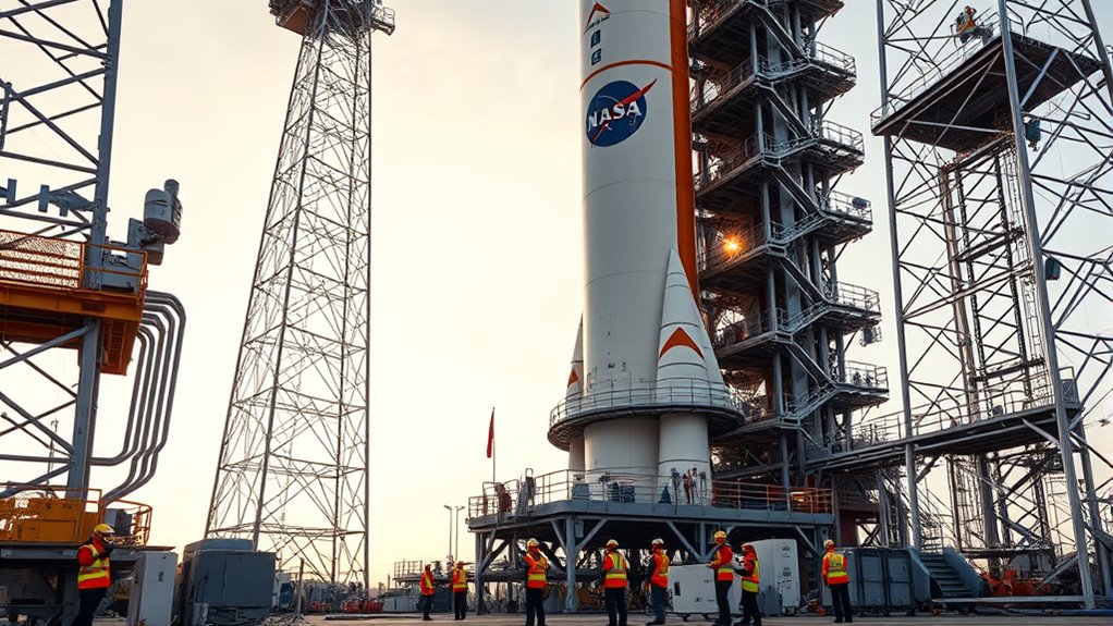 NASA is actively preparing for the Artemis II moon mission, which will be the first crewed lunar flight since Apollo. They’re testing spacecraft systems like heat shields, navigation, and life support to make sure everything performs perfectly. Launch operations are being coordinated carefully to guarantee a safe and successful trip around the Moon. If you keep exploring, you’ll discover the exciting details behind this historic mission and what it means for the future of space exploration.