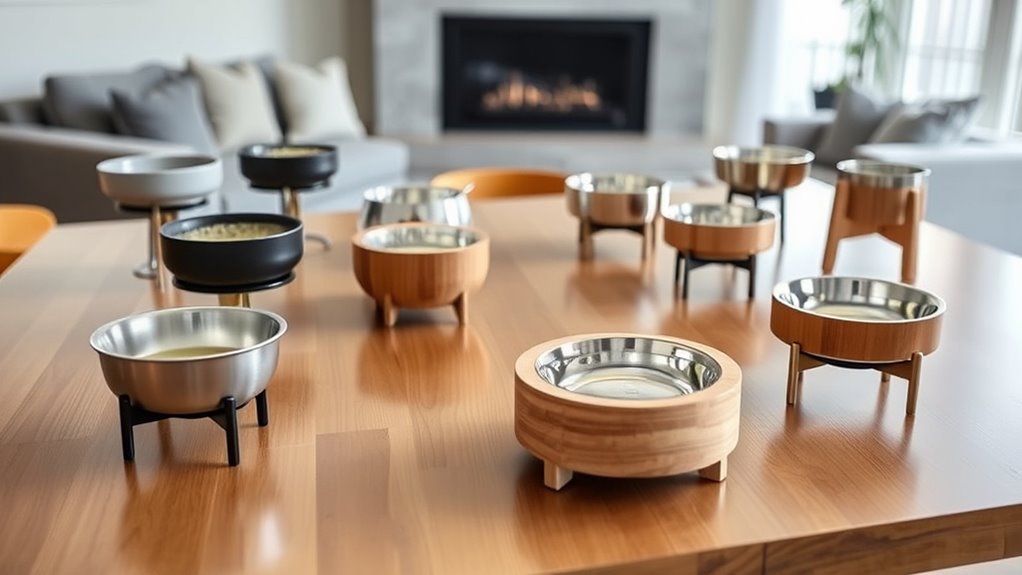 Choosing an elevated dog bowl isn’t just about function; it’s also about how well it blends with your home’s style. I look for designs that match my decor, whether it’s modern, rustic, or minimalist. Finishes like natural bamboo, sleek stainless steel, or painted metal help the bowls integrate seamlessly into my living space. Visual elements such as color, shape, and decorative accents—like paw prints or dog bone clips—add charm and personality. Construction quality matters too, with smooth edges, stable bases, and durable materials enhancing both looks and longevity. An attractive design encourages my pet to use the bowl regularly and makes feeding time more enjoyable for everyone. When style aligns with quality, it’s a win for both aesthetics and practicality.
