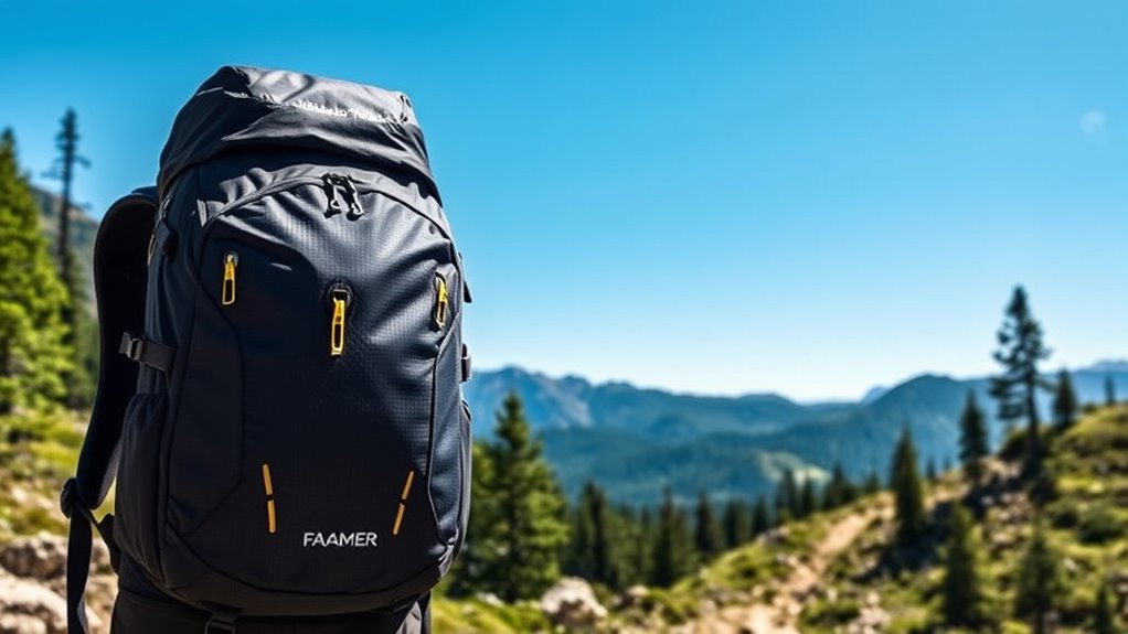 Ever wondered how to keep your gear dry during unpredictable weather? The key is choosing a backpack made from waterproof or water-resistant fabrics like nylon, polyester, or ripstop with waterproof coatings. Look for sealed or waterproof zippers and compartments to prevent water from seeping in during heavy rain. A dedicated rain cover stored in a pocket is also essential for prolonged downpour, offering extra protection. Reinforced stress points and double-layer bottoms boost durability and help prevent tears when facing harsh weather or rugged terrain. Additionally, ventilation features such as breathable mesh panels and padded backs reduce internal moisture buildup, keeping you comfortable in humid conditions. Prioritizing weather resistance ensures your gear stays dry and your adventure continues smoothly, no matter the forecast.