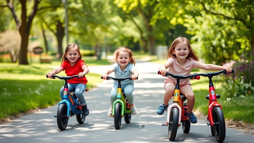 Choosing the right balance bike depends heavily on matching the bike’s size and features to your child’s age and developmental stage. For the best fit, select a bike with seat height and wheel size appropriate for your child’s age and height, ensuring they can reach the ground comfortably. For toddlers aged 1-3, look for 12-inch bikes with safety features like limited steering angles or no pedals, which help build confidence. Older children, aged 4-8, benefit from 14-16 inch bikes that support their growing motor skills and include adjustable seats and handlebars for continued comfort. Always consider your child’s motor skill level—an age-appropriate bike will encourage skill development and confidence without feeling overwhelming or too easy. Proper age alignment makes learning to ride safer and more enjoyable.