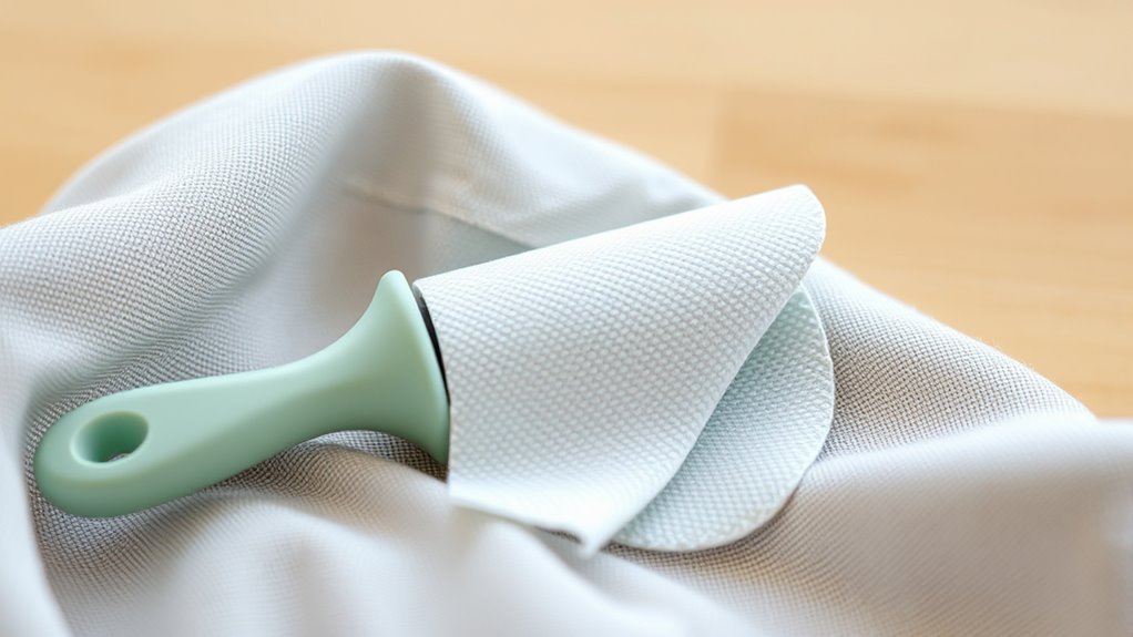 Reusable lint rollers are low-maintenance, but they do need regular cleaning for ideal performance. I usually rinse the roller with warm water to remove collected lint and pet hair, then let it air dry completely before reuse. Occasionally, I wipe it down with a damp cloth to keep the adhesive surface clean. This simple upkeep ensures my roller stays effective and eco-friendly, saving me money and reducing waste.