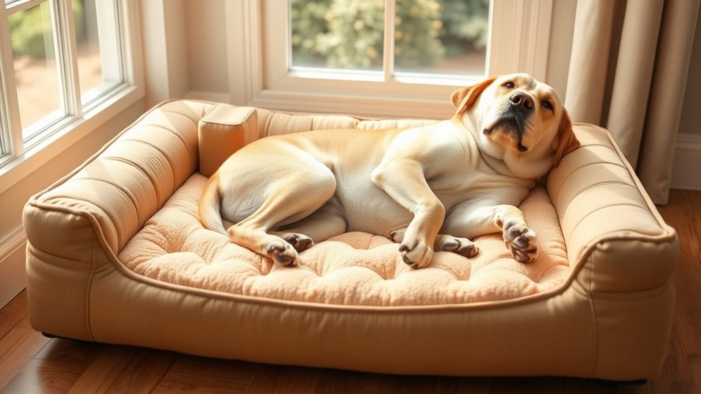 When choosing an orthopedic dog bed, safety features play a key role in guaranteeing your pet’s well-being. Non-slip bottoms are essential, preventing the bed from sliding and reducing fall risks during movement or getting on and off. Waterproof linings or covers protect the foam from accidents, maintaining hygiene and preventing mold or bacteria growth. Reinforced seams, durable zippers, and chew-resistant materials help prevent tearing or damage, avoiding potential choking hazards. Elevated or bolstered edges provide extra neck and head support, reducing strain and injury from awkward sleeping positions. Additionally, certifications like CertiPUR-US or OEKO-TEX ensure the materials are non-toxic, safe, and free from harmful chemicals. Prioritizing these safety features keeps your furry friend secure and healthy while enjoying their orthopedic bed.