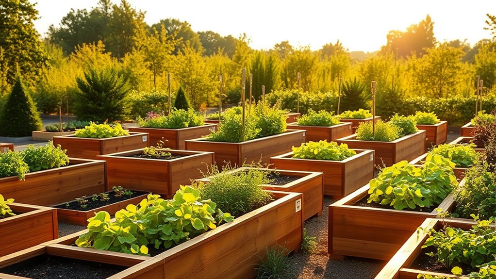 Think of raised beds like a well-drained pond, where excess water flows freely, preventing stagnation. They do require special drainage considerations—adding a layer of gravel or coarse material at the bottom helps excess water escape. I always guarantee my beds have proper drainage to avoid waterlogging, which can drown roots and invite pests. Good drainage keeps my garden healthy, vibrant, and thriving all season long.