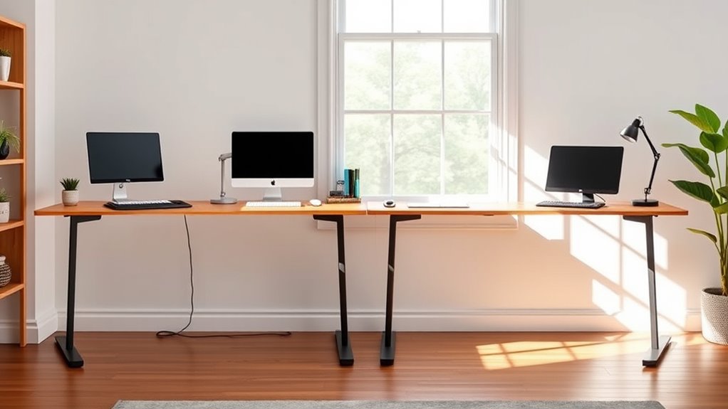 Adjustability range plays a key role in finding a standing desk that fits your needs. It determines the minimum and maximum heights, which is vital for comfort and ergonomics. A wider range—typically from about 23 to 48 inches—lets you easily switch between sitting and standing, promoting better posture and movement. If you’re taller or shorter than average, making sure the desk’s height adjusts enough for your body is essential. Some desks include preset memory buttons, so you can quickly set your preferred sitting and standing heights. Always verify that the lowest height is suitable for seated use and the highest comfortably supports standing. This flexibility ensures the desk adapts to your unique ergonomic needs and daily routines.